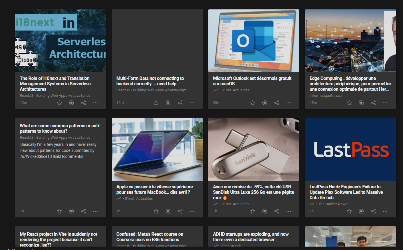 Ma veille technologique est ciblée sur le développement web en général, je suis aussi abonné à des flux axés sur la cybersécurité et les technologies du numérique pour être tenu informé chaque jours de l'actualité. J'utilise Inoreader, un agrégateur de flux permettant de gérer ses flux et d'organiser les différents articles en tableaux.