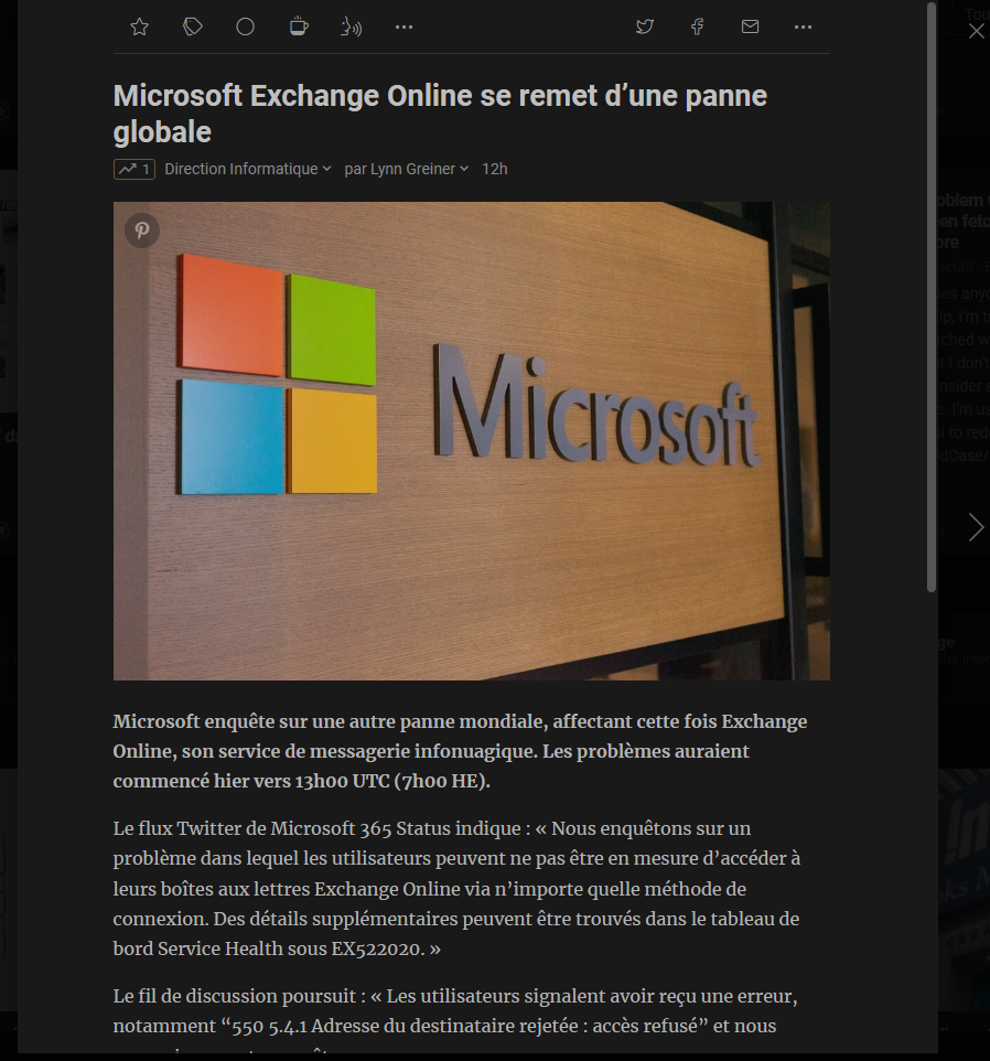 Voici un exemple d'article disponible via Inoreader, il y a une première vu sur l'agrégateur de flux puis il est possible en cliquant sur l'article de visiter le site auteur de l'article afin de voir la source et l'article au complet.