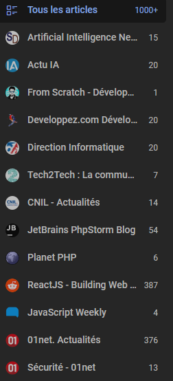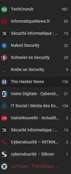 Voici des exemples de flux auquels je suis abonné. Ces différents flux me donnent plus de 100 articles par jour parmi lesquels j'en choisis 1 ou 2 sur des sujets qui m'interessent.